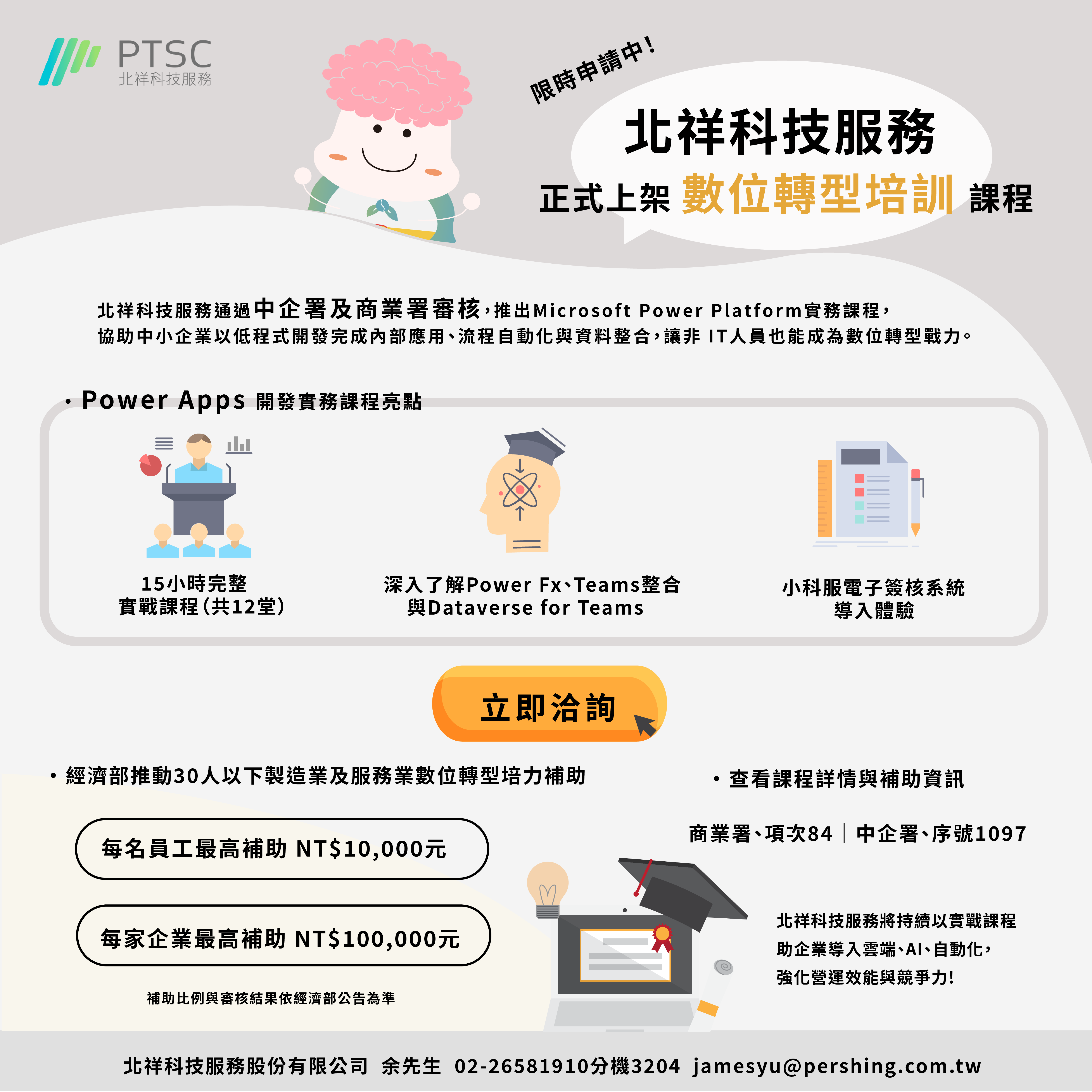 本課程以 Microsoft Power Platform(Power Apps、Power Automate、Teams 整合) 為核心,協助中小企業以低程式開發方式打造內部應用、流程自動化與資料整合,讓非 IT 背景員工也能成為企業數位轉型的推手。